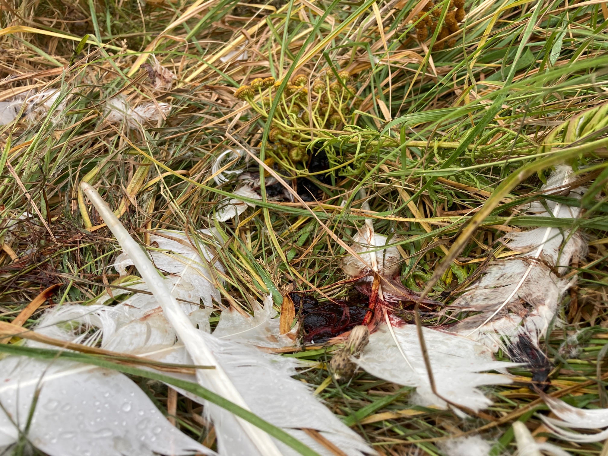 Der er stadig rester af fjer og blod, der hvor svanen blev fundet. Foto: Presse-fotos.dk