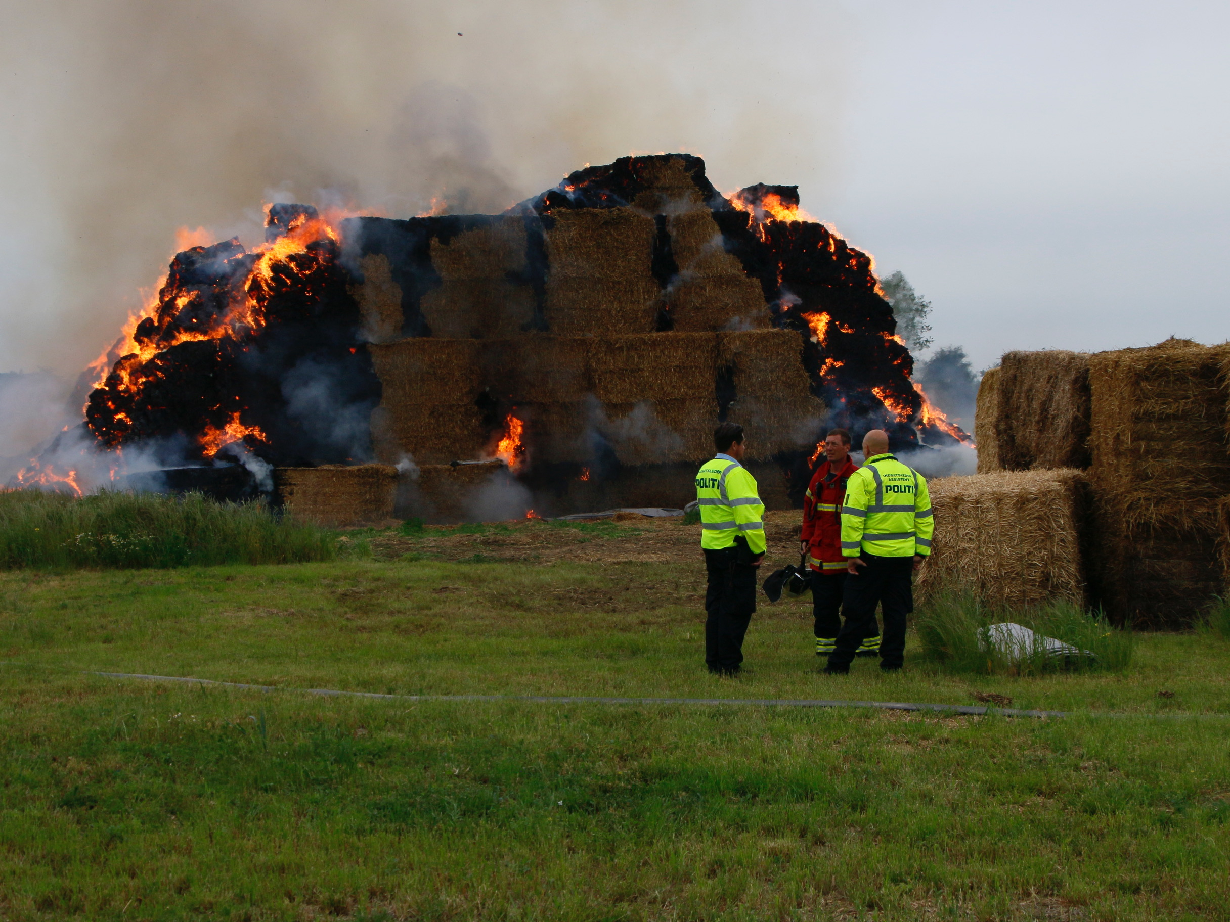 Brandvæsen og politi er ikke længere på stedet, men brandvæsnet holder øje med stedet, i forbindelse med udbrændingen af halmoplaget.