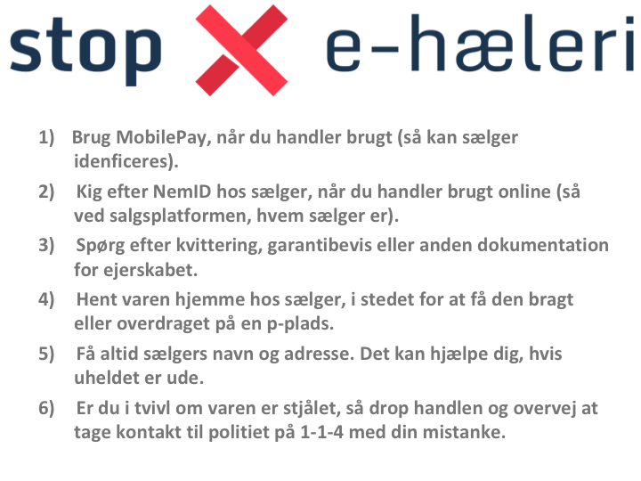 Politiet anbefaler bl.a., at man altid bruger MobilePay, når man handler brugt. Dette efterlader et spor, så den, der modtager pengene, kan findes igen. Derudover anbefales man også altid at spørge efter en kvittering eller et garantibevis, så det kan sandsynliggøres, at sælgere er kommet lovligt til varerne.