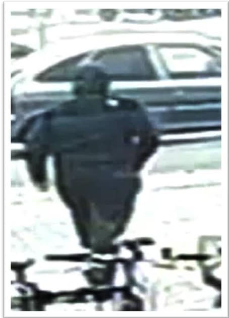 Mand, mellemøstlig af udseende, kraftigt bygget, iført sort jakke med hætten oppe, formentlig af mærket ”North Face”, mørke joggingbukser, mørke sko. Manden medbragte en kniv.