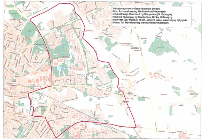 - Det er politidirektøren i politikredsen, der træffer beslutningen om at oprette en visitationszone. Der henvises til det vedlagte kort med det nærmere geografiske område, der i øvrigt er afgrænset inden for følgende: