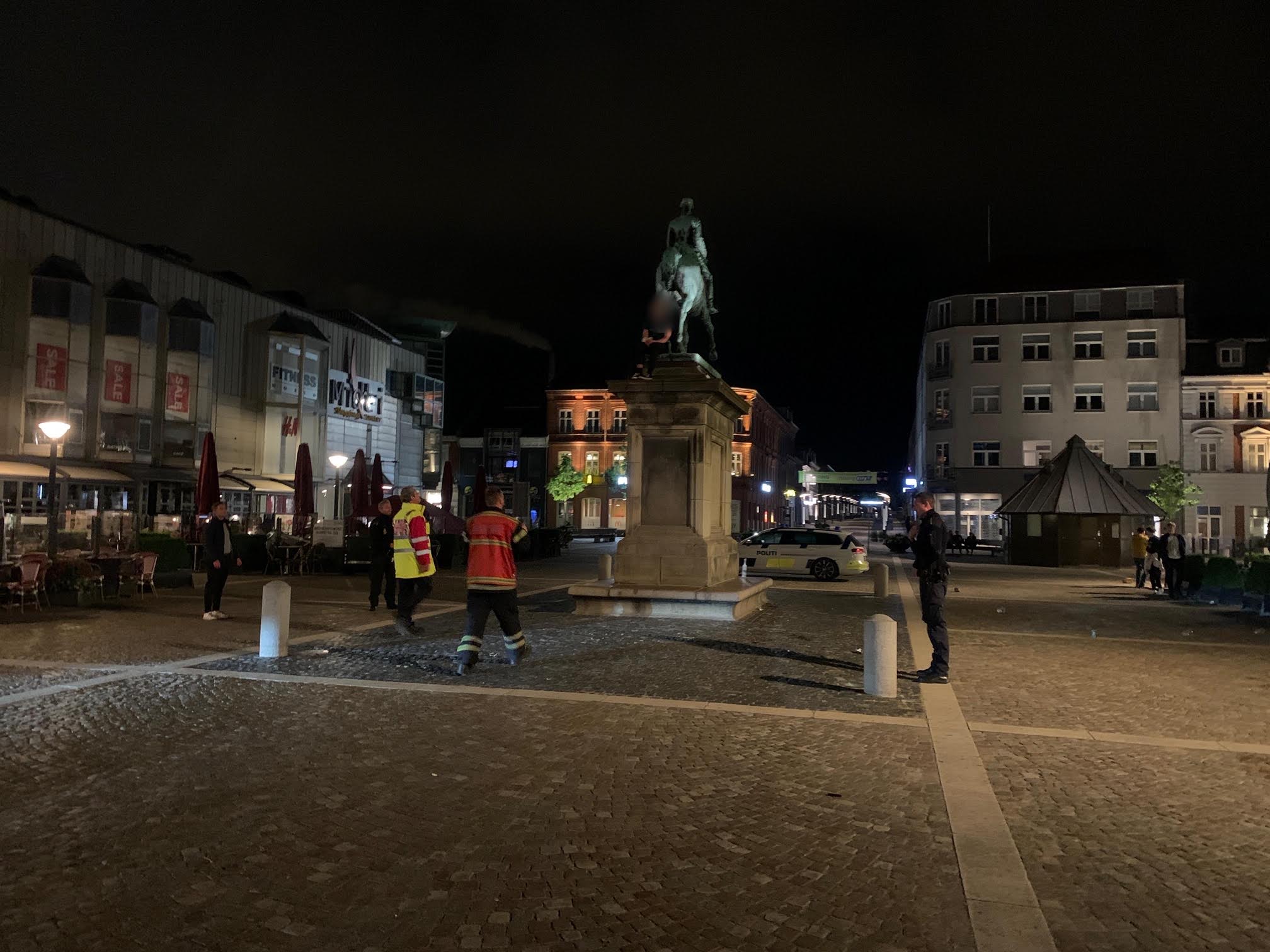 Den unge mand bestemte sig for at kravle op i rytterstatuen af Christian den 9. som står på torvet i Esbjerg. Det er der som sådan ikke noget usædvanligt i, for hvert eneste år gør alle de festglade studenter det samme.