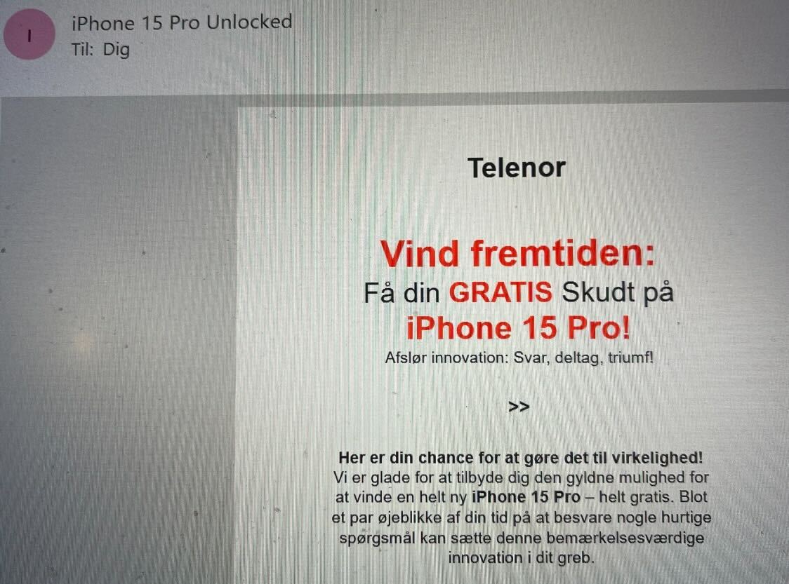 ‘Her er din chance for at gøre det til virkelighed! Vi er glade for at tilbyde dig den gyldne mulighed for at vinde en helt ny iPhone 15 Pro – helt gratis. Blot et par øjeblikke af din tid på at besvare nogle hurtige spørgsmål kan sætte denne bemærkelsesværdige innovation i dit greb,’ fremgår det af mailen fra afsendere, der udgiver sig for at være teleselskabet Telenor.