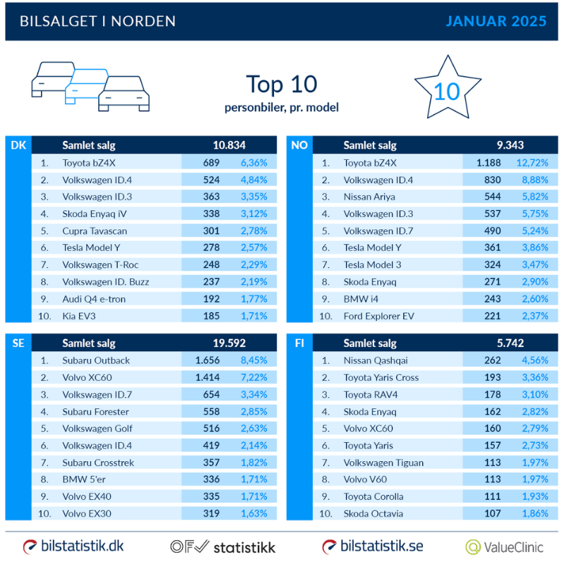 Personbilsalget i Norden var generelt præget af stigninger i januar 2025.