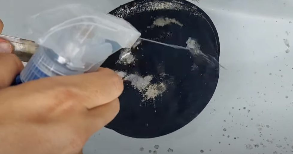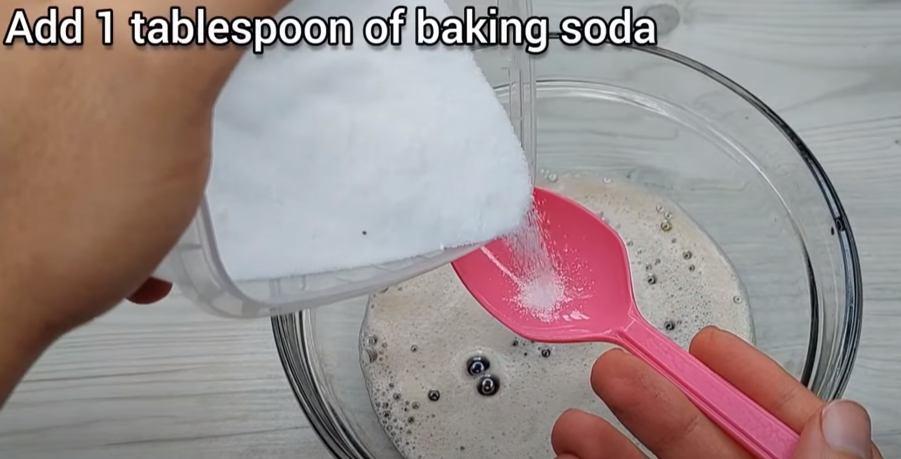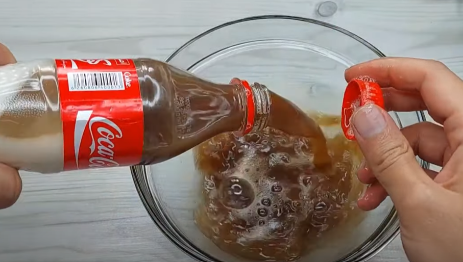 Derefter skal du tilføje 1 tsk natron til blandingen med Coca-Cola, tandpasta og opvaskemiddel og mikse det hele sammen.