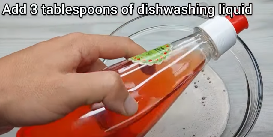 Når du har hældt blandingen ned i skålen, skal du tilføje tre teskefulde opvaskemiddel.