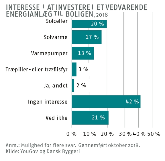 En varmepumpe i jorden eller solceller på husets tag. Mere end hver tredje boligejer er interesseret i at investere i et vedvarende energianlæg. Særligt interessen for solceller er høj, efterfulgt af solvarme og varmepumper, viser en spørgeundersøgelse blandt boligejerne, som YouGov har lavet for Dansk Byggeri.