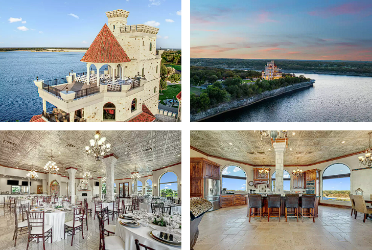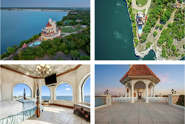 Parsons Castle, som er udbudt af Eric Hacker fra Hacker Property Group, imponerer ikke kun med sine tårne og vindelbro. Dets beliggenhed er også enestående, placeret på en skarp, V-formet klippe, der strækker sig ud over Lake Whitney.
