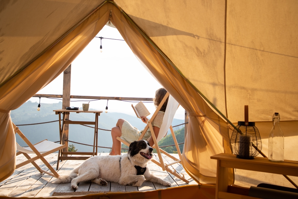 Luksustelte, træhytter og små hytter tilbyder en hyggelig base for både dig og din hund.
