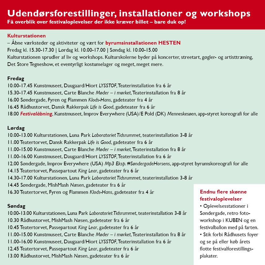 Mange af forestillingerne til teaterfestivalen er gratis. Du kan her se en oversigt over de forskellige gratis arrangementer:
