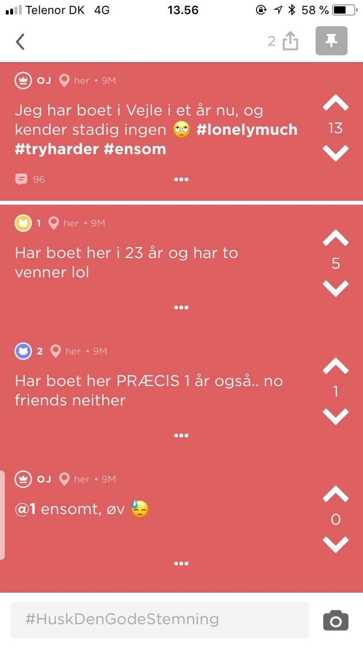 Heldigvis for Signe så kæmpede hun alligevel imod angsten for det sociale, og derfor endte hun med at oprette et opslag på den anonyme sociale app Jodel, som i bund og grund er en anonym opslagstavle i den by man bor i.