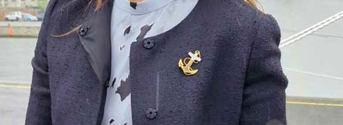 Se billedet af dronning Mary der bærer en anker-broche under besøget i Vejle nedenfor