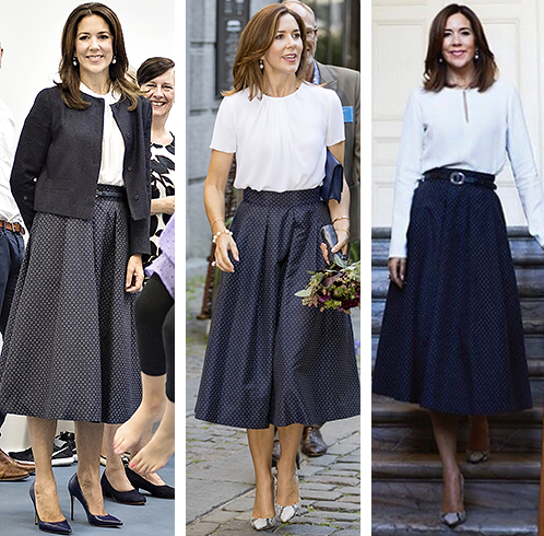 Denne navy-prikkede nederdel ser ud til at være en favorit blandt de royale, for også svenske kronprinsesse Victoria har båret en tilsvarende model i september 2016 og igen i april 2018. Det viser, at klassiske og tidløse designs, som denne nederdel er yderst populære blandt de royale.