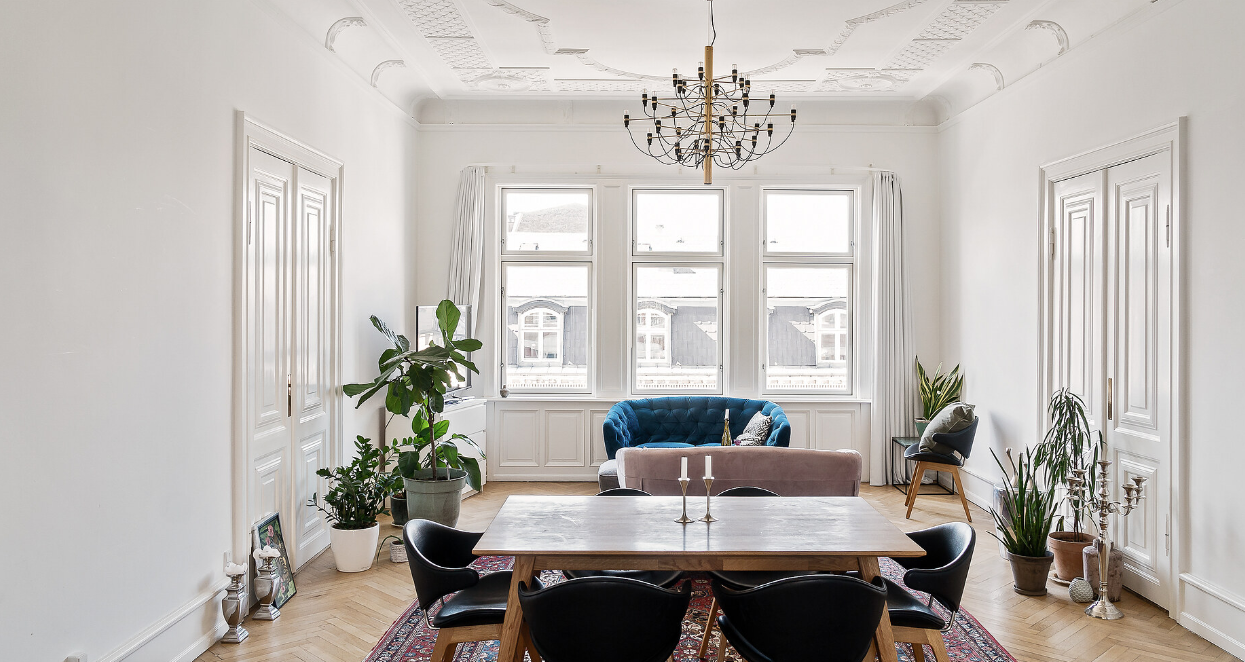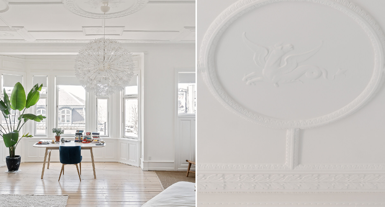 Her er alle de eftertragtede detaljer såsom høje paneler, fine ruder, udsmykkede lofter og sildebensparket, som alle bidrager til den gennemførte stil.
