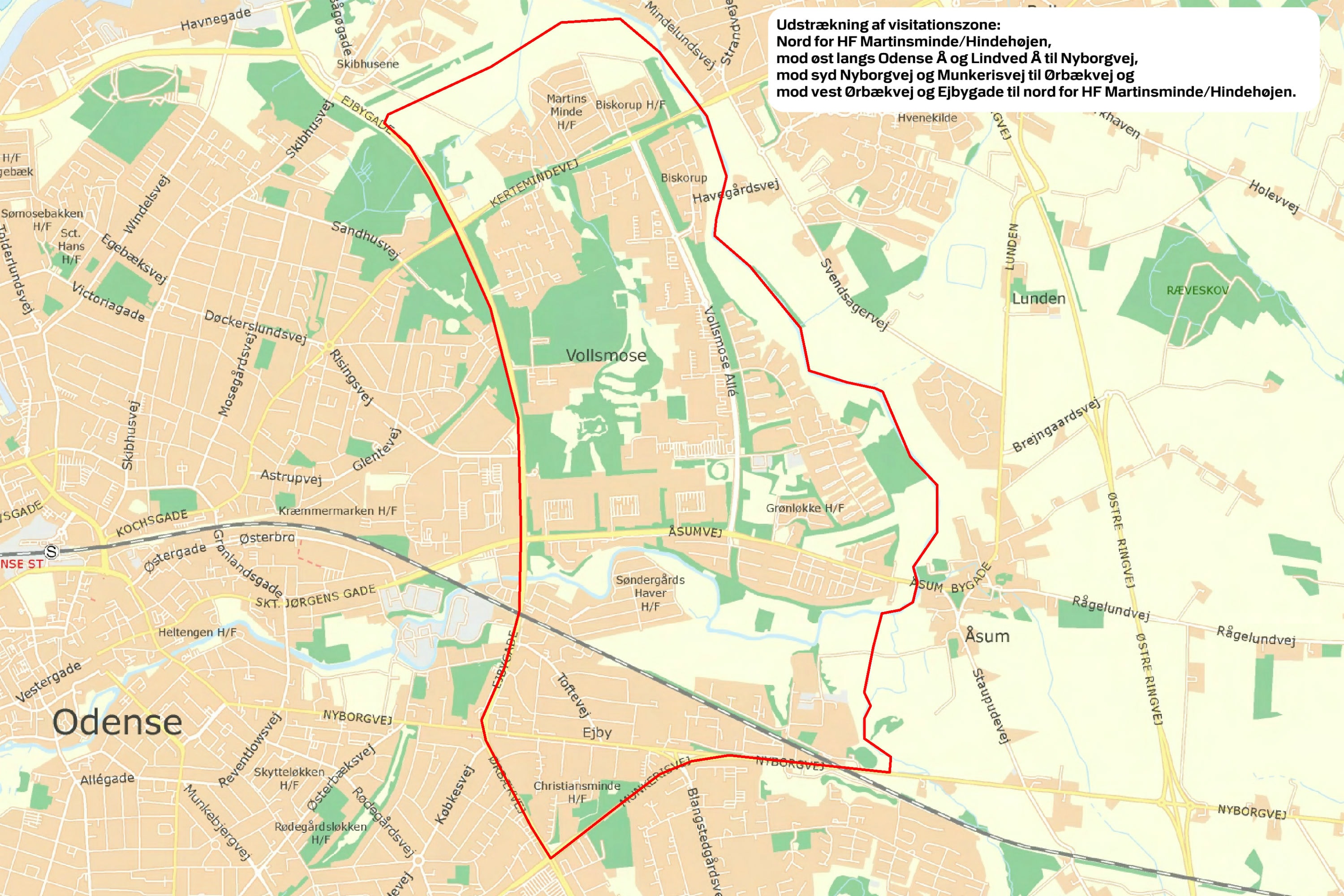 Den skærpede strafzone er afgrænset af Vollsmose Allé mod øst og Åsumvej mod syd. Det drejer sig om Bøgeparken, Egeparken, Fyrreparken og området omkring Vollsmose kirke og bibliotek.