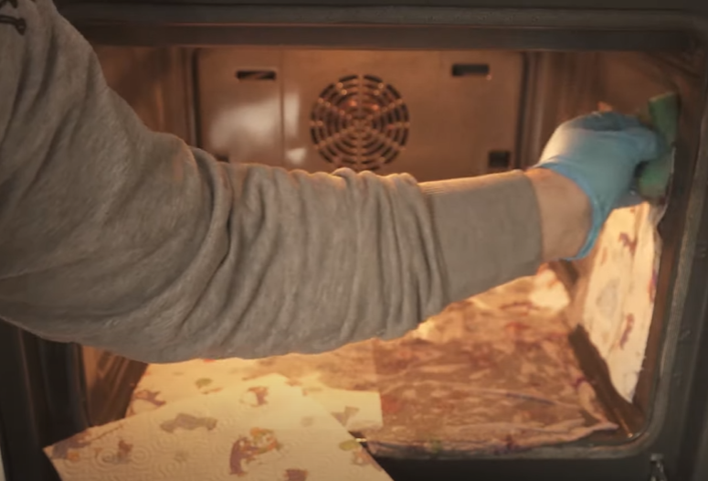 Derefter vasker du ovnens inderside let med blandingen, så alle overflader er våde. Når det er gjort, skal du sætte køkkenrulle fast på overfladerne, som det ses på billedet herunder.