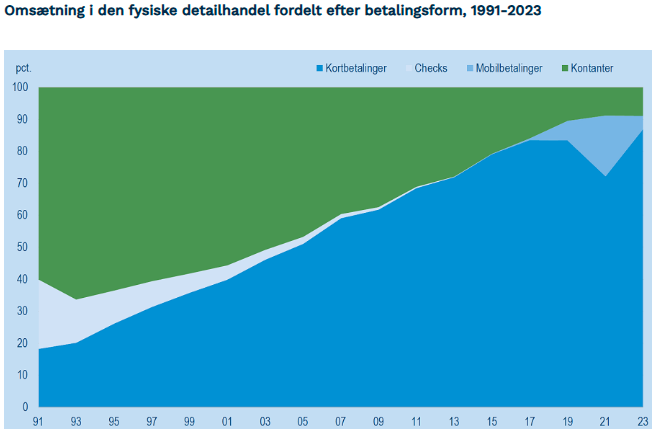 Dermed er andelen af kontantbetalinger faldet støt siden 1991, hvor andelen af kontantbetalinger i fysiske butikker udgjorde 60 procent.