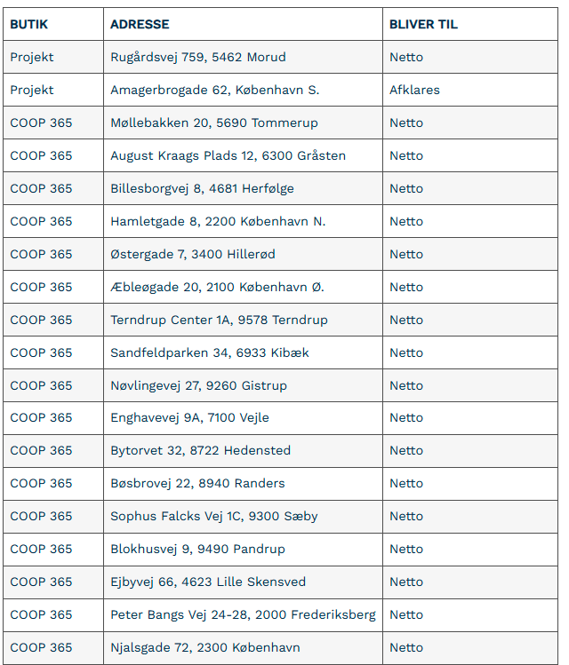 I aftalen indgår også fire COOP 365-butikker, som Salling Group vælger ikke at genåbne, men i stedet forsøger at udleje til andre formål. Her bliver der naturligvis taget hånd om alle medarbejdere.