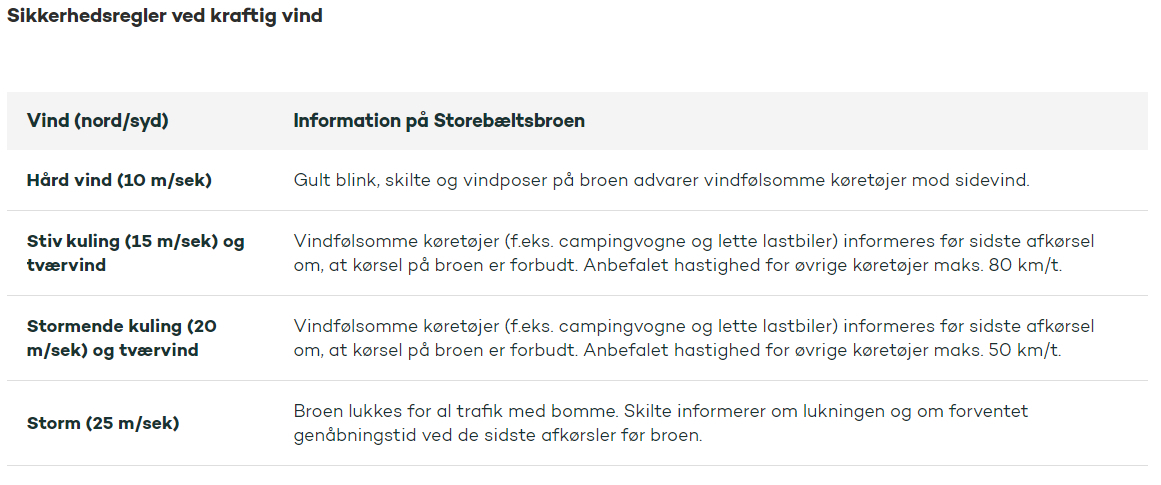 “Er der stærk blæst på broen, er dit køretøjs vindfølsomhed afgørende. Store køretøjer har naturligt en større vindflade end små køretøjer, og f.eks. er en tom lastbil langt mere vindfølsom end en personbil. En personbil vil næsten altid kunne køre over broen, hvis blot den overholder den anbefalede hastighed. En personbil med anhænger eller campingvogn bagpå er langt mere følsom over for vind end en personbil uden,” står der blandt andet på hjemmesiden.