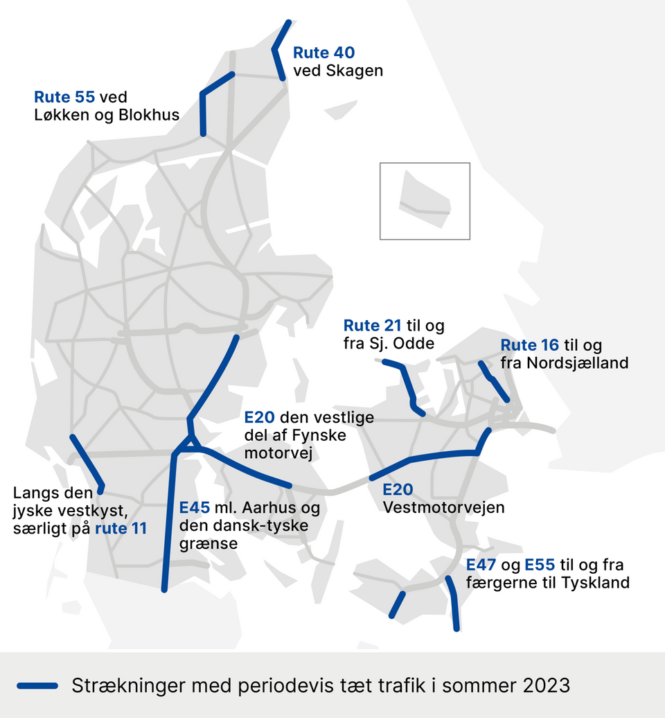 Man vil også kunne opleve ekstra lokal trafik fra de større sommerhusområder, særligt langs den jyske vestkyst, ved Skagen samt fra Nordsjælland. Vi anbefaler at køre uden for de mest trafikerede tidsrum, at være i god tid og at holde sig opdateret om den aktuelle trafiksituation fx på www.trafikinfo.dk eller via P4 Trafik.
