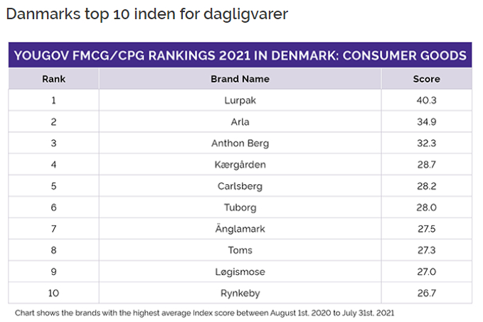 “Lurpak er populær verden over og er helt i top på den danske ranking med en score på 40,3, og ikke nok med at Arla kan glæde sig over Lurpak’s flotte placering, så er Arla selv kommet ind på andenpladsen med en score på 34,9. Tredjepladsen går til gengæld til Anthon Berg med score på 32,3.”