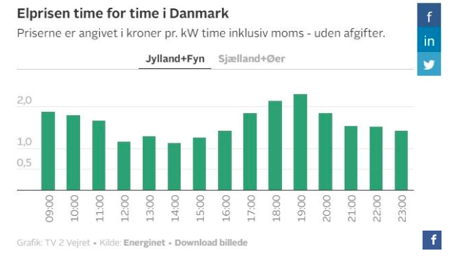 Det er først klokken 17, at prisen tager et markant hop. Den vil her ligge mellem 1,9 og 2,3 kroner.