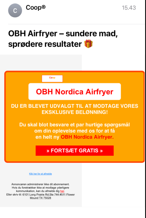 “Der er en ny svindelkampagne i omløb som udgiver sig for at være fra COOP og som fortæller modtageren, at man er udvalgt til at modtage en OBH Airfryer,” skriver koncernen, som efterfølgende slår fast, at de ikke udsender sådanne beskeder: