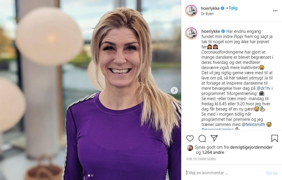 “Har endnu engang fundet min indre Pippi frem og sagt ja tak til noget, som jeg ikke har prøvet før. Coronaudfordringerne har gjort, at mange danskere er blevet begrænset i deres hverdag, og det medfører desværre også mere inaktivitet,” skriver Hørlykke og fortæller videre, at netop det, vil hun gerne hjælpe med at lave om på.