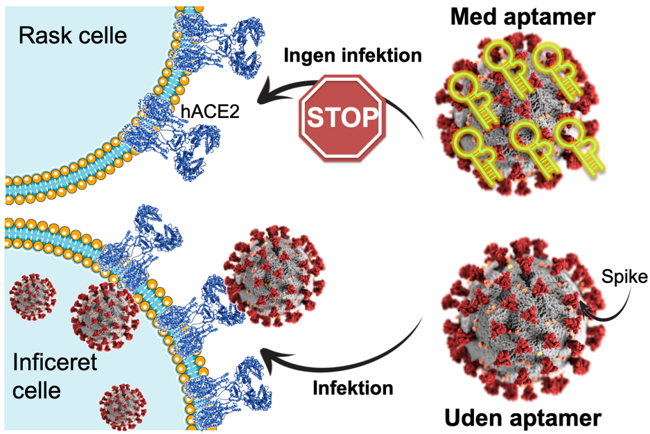 Ved at klistre sig fast på spike proteinet på virusoverfladen kan den nyudvikledede aptame forhindre, at virusset kan bruge som en nøgle til at trænge ind i cellerne.