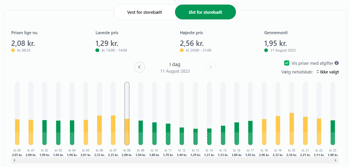 Mellem 13 og 14 vil det koste cirka 1.29 kroner pr. kilowatt, men det i sig selv er stadig en billig pris i forhold til, hvis det hverken blæse- eller solskinsvejr.