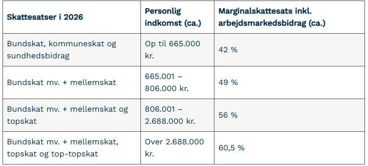 I 2026 bliver mellemskatten 7,5 procent. Når indkomsten overstiger cirka 806.000 kroner, skal der betales topskat på cirka 56 procent inklusiv. arbejdsmarkedsbidrag.