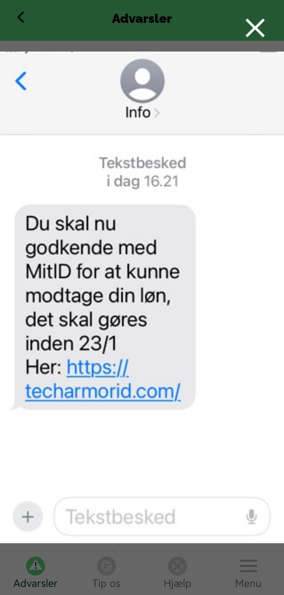 I øjeblikket forekommer der forskellige henvendelser om MitID, hvor svindlere forsøger at få fat i personfølsomme oplysninger ved at udgive sig for at være fra MitID. De bruger blandt andet ens løn og opdatering af kundeoplysninger som påskud for at få dig til at logge på. I SMS’en fremgår et link, som de beder dig trykke videre på: Det skal du ikke!