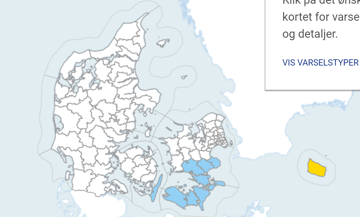 Varslet gælder i øjeblikket fra klokken 08 onsdag morgen til klokken 20 onsdag aften. Det er dog værd at bemærke, at der er en lille risiko for, at den kraftigste nedbør kan passere Bornholm enten vestligt eller østligt.