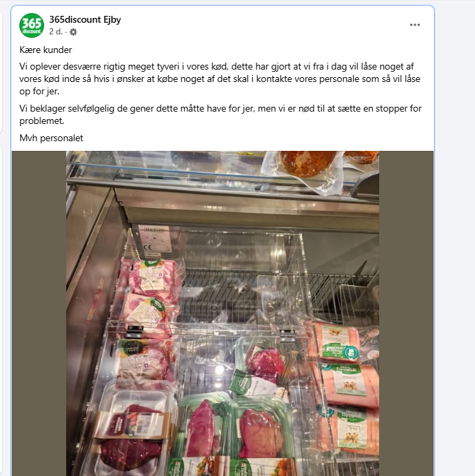 “Vi oplever desværre rigtig meget tyveri i vores kød. Dette har gjort, at vi fra i dag vil låse noget af vores kød inde. Så hvis I ønsker at købe noget af det, skal I kontakte vores personale, som så vil låse op for jer.”