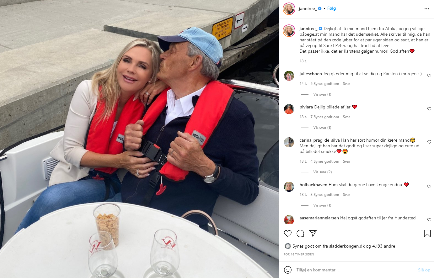 “Dejligt at få min mand hjem fra Afrika, og jeg vil lige påpege,at min mand har det udemærket. Alle skriver til mig, da han har stået på den røde løber for et par uger siden og sagt, at han er på vej op til Sankt Peter, og har kort tid at leve i,” skriver Janni til et billede af parret sammen.