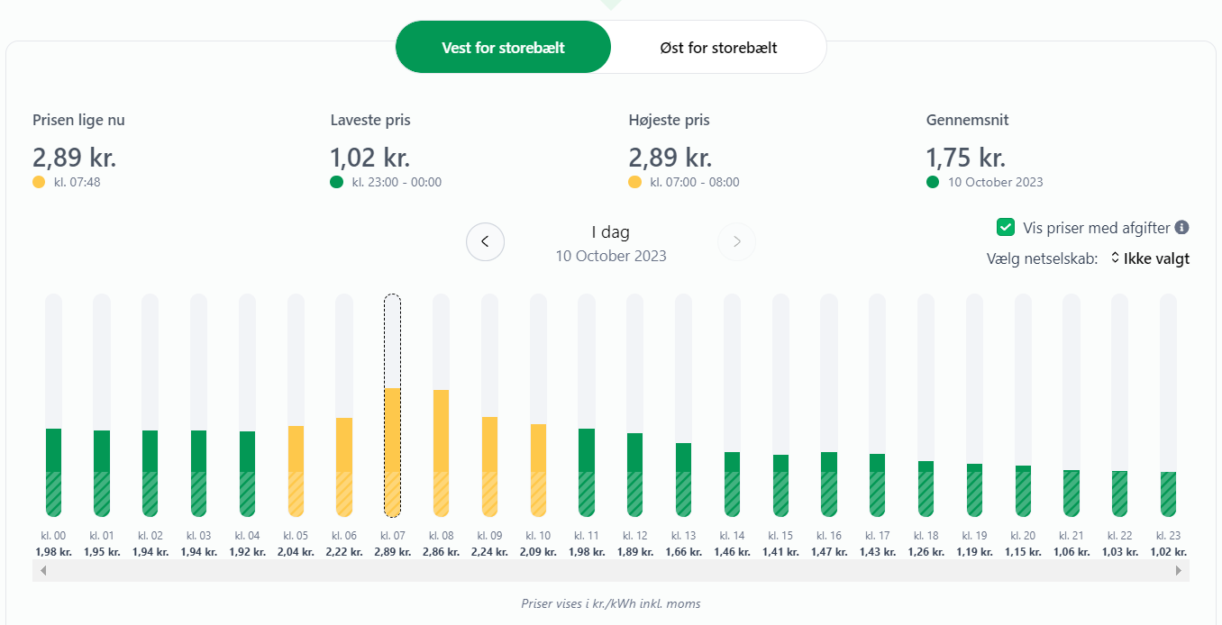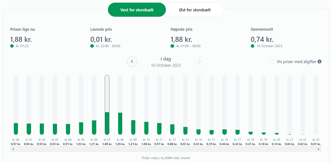 Det betyder, at den samlede pris på 1 kWh vil ligge på 1,02 kroner, når vi når det billigste tidspunkt på dagen, som er klokken 23.00. Det er dog stadig enormt billigt.