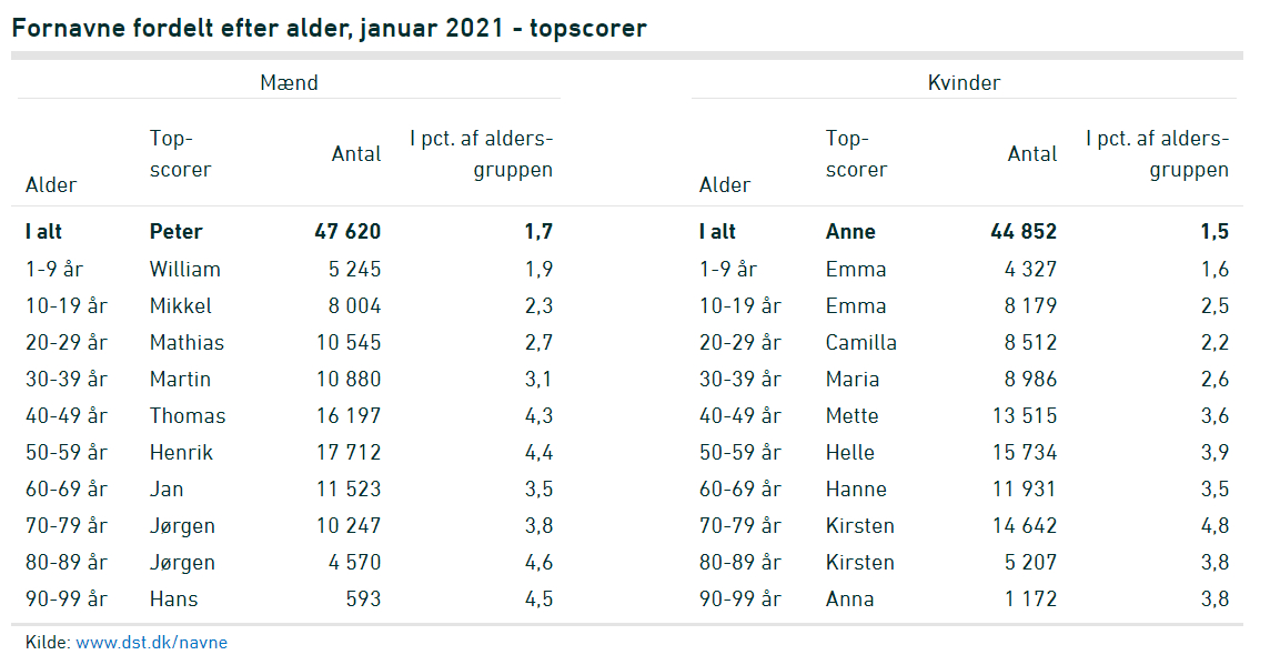 I den samlede befolkning i starten af januar 2021 var Peter det mest anvendte fornavn til mænd. Anne var topscorer hos kvinderne. Deler man befolkningen op i 10-års aldersgrupper, så er hverken Peter eller Anne topscorer i nogen af grupperne.