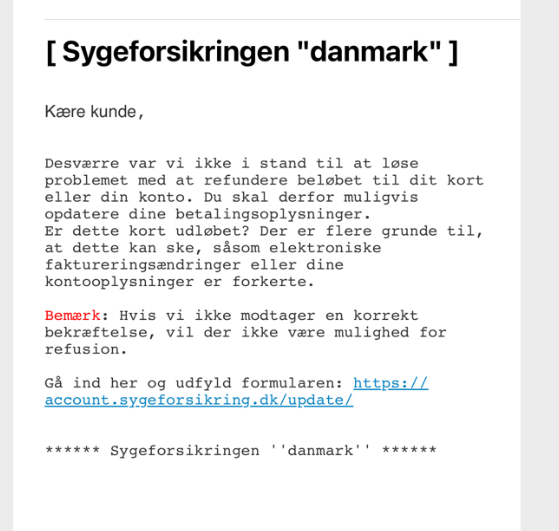 “Endnu en falsk mail med Sygeforsikringen “danmark” som afsender er i omløb. I mailen bliver kunden opfordret til at udfylde en formular for at modtage refusion. Sygeforsikringen “danmark” bruger hverken ord som kunde, formular eller refusion,” lyder den klare melding.