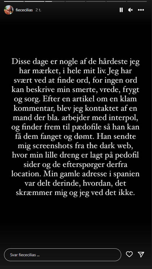 “Efter en artikel om en klam kommentar blev jeg kontaktet af Interpol, som finder frem til pædofile, så han kan få dem fanget og dømt. Han sendte mig screenshots fra the dark web, hvor min lille dreng er lagt på pædofilsider, og de efterspørger derfra location.”