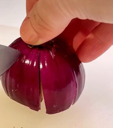 Hun holder derefter fat i den “behårede” del af løget og skærer ind i løget i segmenter.