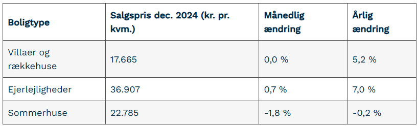 Sammenligner vi med december sidste år, steg huspriserne med 5,2 procent, mens lejlighedspriserne steg med 7 procent på landsplan. Både hus- og lejlighedspriserne er steget i alle regioner det seneste år.