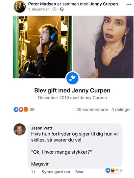 Den tidligere racerkører, Jason Watt, er en af de personer, der har kommenteret på det opslag, som Peter Madsen har lagt ud på sociale medier, hvor der står, at han er blevet gift med Jenny Curpen.