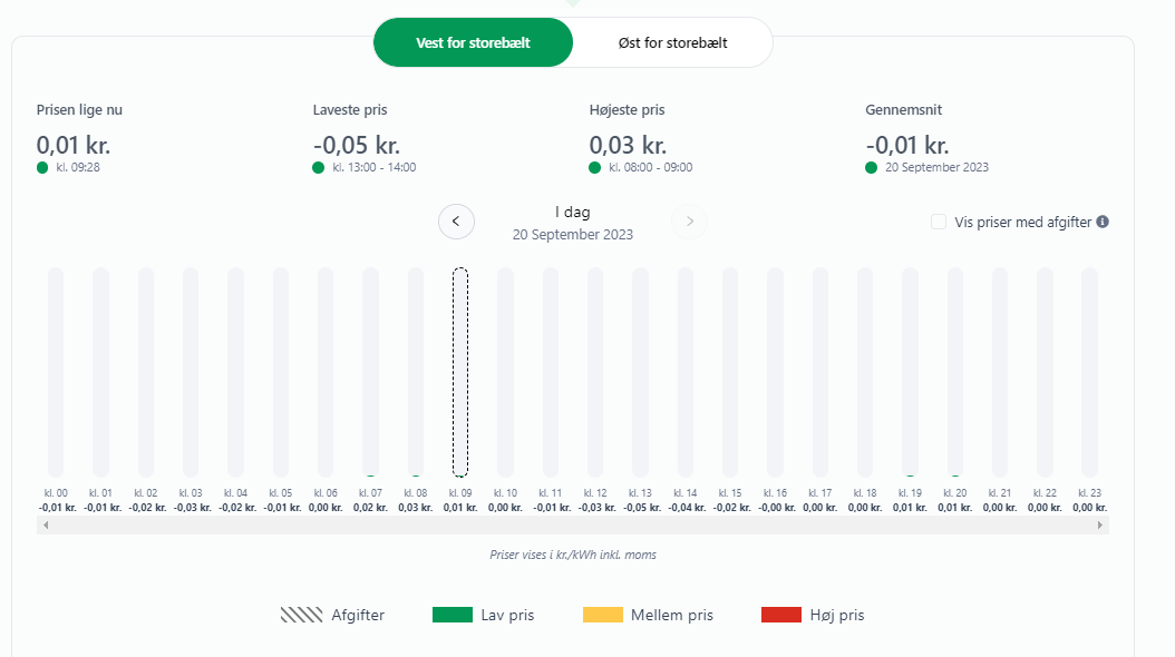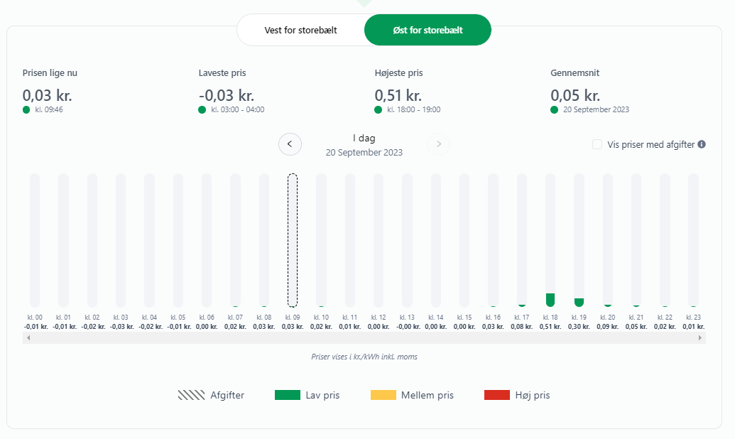 Øst for Storebælt bliver det dog lidt dyrere – men der er kun tale om få øre. Mere specifikt når den rene elpris op på 0.51 kroner pr. kWh mellem klokken 18 og 19.