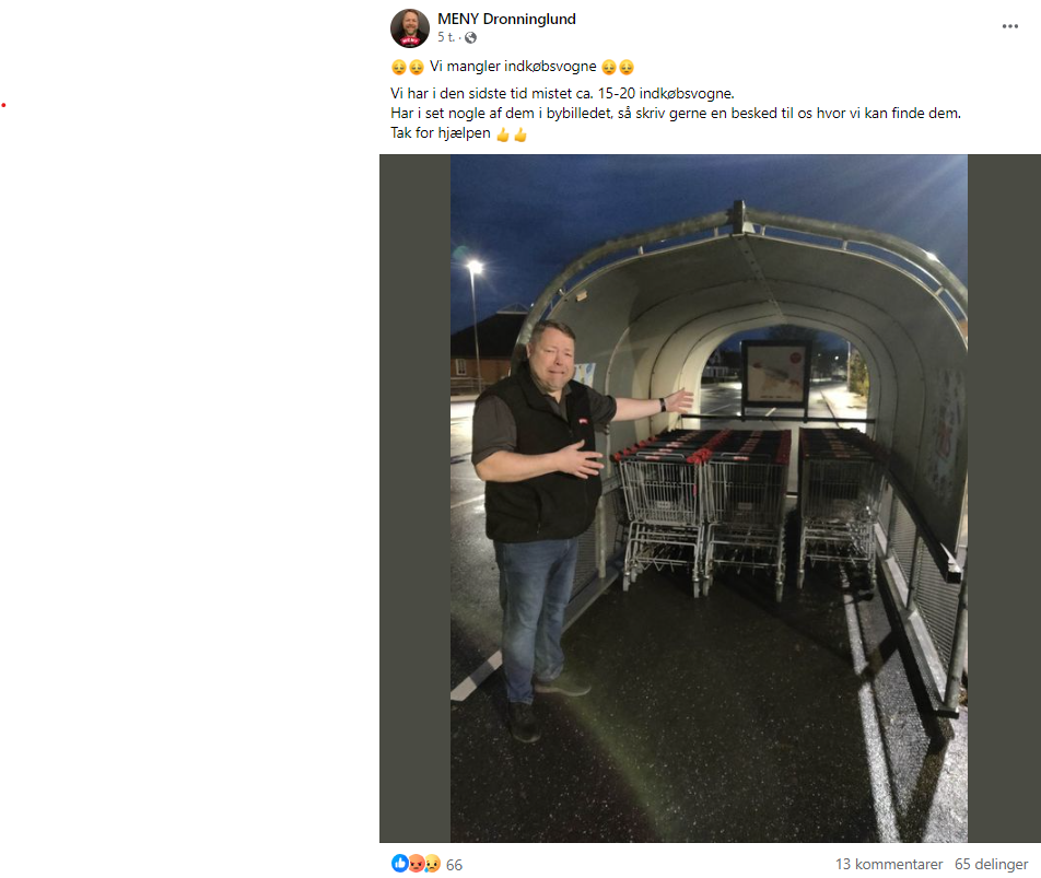 ‘Vi mangler indkøbsvogne. Vi har i den sidste tid mistet ca. 15-20 indkøbsvogne. Har i set nogle af dem i bybilledet, så skriv gerne en besked til os hvor vi kan finde dem. Tak for hjælpen,’ lyder det fra butikken i et Facebook-opslag.