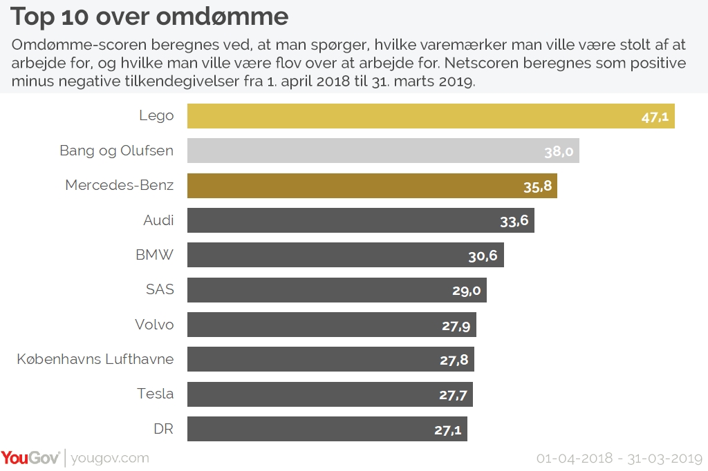 Lego topper igen i år YouGov BrandIndex’ liste over varemærker, som danskerne ville være mest stolte over at arbejde for med en omdømme-score på 47,1. Bang og Olufsen indtager andenpladsen med en omdømme-score på 38,0, mens Mercedes-Benz snupper tredjepladsen med en score på 35,8.