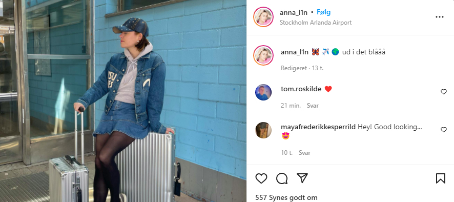 Dette afslører hun via en hel del billeder, hvor hun samtidig skriver, at hun er på tur i Europa med DRs klimakorrespondent, Thøger Kirk.