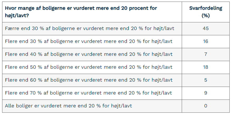 Her svarer en femtedel af mæglerne, at flere end 50 procent af vurderingerne ligger uden for forsigtighedsprincippet (+/- 20 procent), mens en femtedel af mæglerne svarer, at flere end 30 procent af vurderingerne er uden for forsigtighedsprincippet. Derimod svarer næsten halvdelen, at det er mindre end 30 procent af vurderingerne, der er skæve ift. forsigtighedsprincippet.