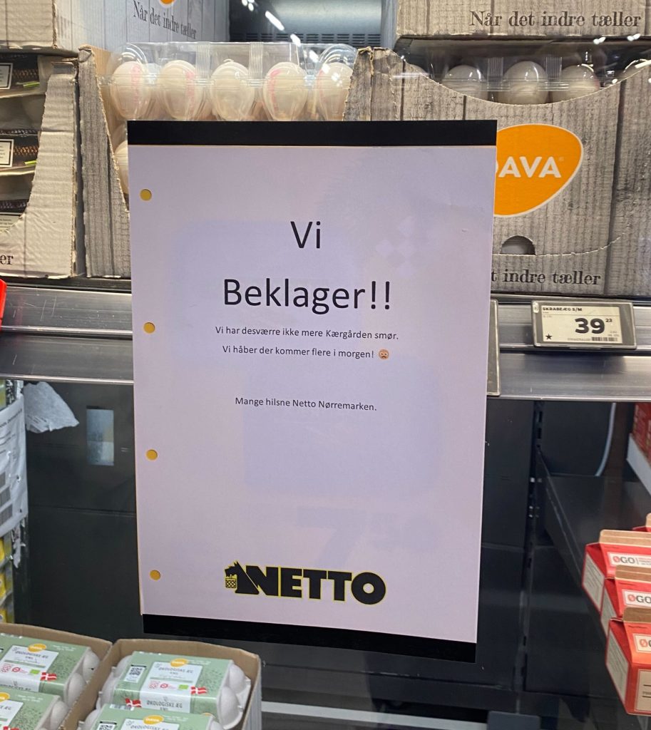 “Vi Beklager!! Vi har desværre ikke mere Kærgården smør. Vi håber der kommer flere i morgen!” stod der med store typer på skiltet, som var underskrevet af personalet i butikken.