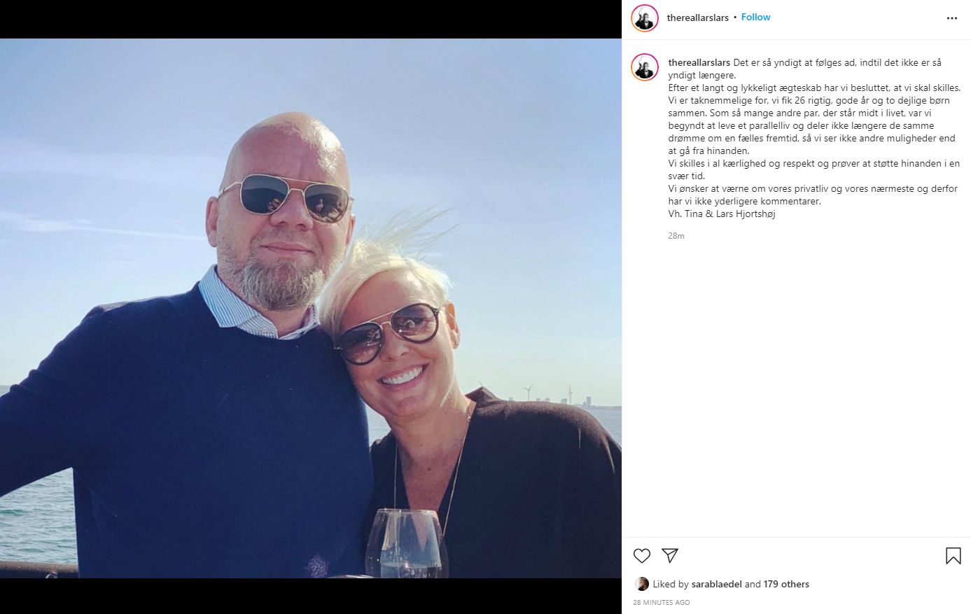 “Vi skilles i al kærlighed og respekt, og prøver at støtte hinanden i en svær tid. Vi ønsker at værne om vores privatliv og vores nærmeste, og derfor har vi ikke yderligere kommentarer,” slutter han af, inden han underskriver hilsnen fra både ham selv og Tina Bilsbo.