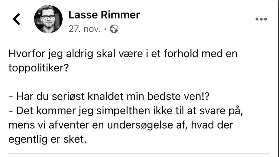 “Der bliver jeg simpelthen nødt til at bede dig om at være en lille smule mere specifik,” lyder svaret. Samtalen fortsætter, og ord som ‘parforholdshjemmel’ og ‘redegørelse’ bliver brugt. Antallet af likes og delinger viser, at der er rigtig mange, der finder sketchen sjov. Det gør Lasse Rimmer også. Ifølge ham var det nemlig komikeren selv, der fandt på joken.
